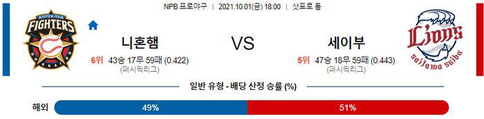 9월20일 2군경기 등판에서 6이닝 1피안타 무실점을 기록하고 콜업 된 요자 카이토 투수를 만만하게 볼수 없지만 홈경기의 유리함과 생소함 이라는 추가 무기를 장착하게 되는 타테노 가즈아키 투수에 대한 기대치가 높은 선발 매치업 이다. 니혼햄 승리 가능성을 추천 한다.