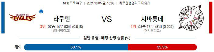 홈에서 2위 오릭스에게 스윕 패배를 당하며 승차 없이 퍼시픽리그 1위를 기록중인 지바롯데에게 최대 위기가 찾아온 상황. 선발 싸움에서 우위를 장담할수 없고 팀 분위기 에서도 2연승을 만들어 낸 라쿠텐에게 밀리는 상황이지만 오랜 시간 퍼시픽리그 1위를 지키고 있던 지바롯데가 불펜을 쏟아 부으며 최후의 마지노선을 구축한 경기라는 것에 베팅 포커스를 맞추고 싶다. 타이밍 승부로 노려야 하는 경기. 지바롯데 승리 가능성을 추천 한다.