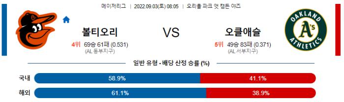 9월 3일 08:05 MLB 볼티모어 : 오클랜드 MLB분석