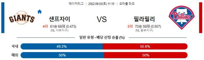 9월 3일 11:15 MLB 샌프란시스코 : 필라델피아 MLB분석