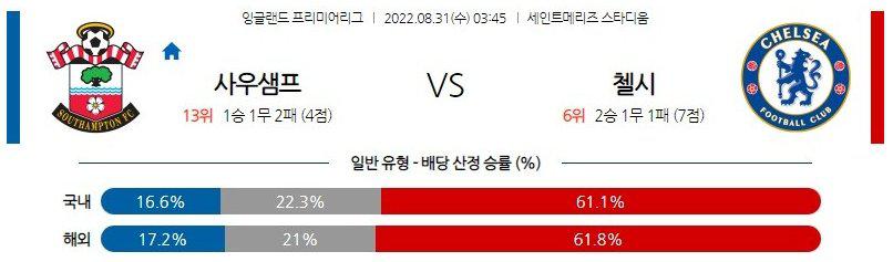 사우샘프턴이 신입 전력들을 필두로 직전 경기에서 나름 수비 안정화를 꾀했다는 점을 고려하면 이번 일정도 언더(2.5 기준)가 유력하겠다. 다만, 첼시는 직전 경기에서 수적 열세에도 불구하고 신승을 따냈다. 특히나, 여전히 투헬 감독의 확고한 맞춤 전술이 빛을 발하고 있는 상황. 여기에 ‘신입 2선 ’스털링(FW)도 데뷔골을 터뜨리며 승리의 일등공신 역할을 했다. 최근 5차례 맞대결에서도 패배가 없다. 이번 일정도 첼시의 승리가 예상된다.