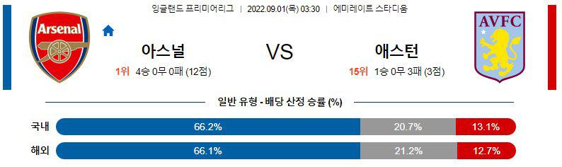 압도적인 퍼포먼스를 자랑 중, 시즌 초반 기세가 상당하다. 리그 4경기 연이은 승리로 상승세 흐름을 이어가는 중. 특히나, 이들 상승세 주 요인은 단연코 막강한 화력이라고 볼 수 있습니다. ‘멀티 2선’ 외데가르드(AMF)의 넓은 시야와 함께 이타적인 플레이가 단연 돋보이며, 마르티넬리(LW) – 사카(RW) 측면 구성의 개인 전술을 통한 돌파 능력 역시 준수한 편입니다. 더불어, ‘핵심 1선’ 제주스(FW)가 전방에서 확실한 영향력을 드러내며 화룡정점을 찍고 있다는 점이 인상적인 부분. 빠른 템포의 역습 전개와 다양한 공격 패턴을 자랑하고 있는 상황으로 주축 수비수의 이탈을 겪고 있는 아스톤빌라를 상대로 멀티 득점 이상까지도 기대해볼 수 있는 환경입니다. 한편, 수비적인 부분에서도 실점 최소화가 확실하게 이뤄지고 있다는 점을 고려했을 때 최대 1실짐 이내로 상대의 공격을 틀어막을 수 있을 것으로 전망한다.