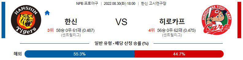 8월30일 한신 타이거스 히로시마 도요카프 NPB 일본 야구 경기 분석입니다. 이번경기는 오후 6시에 시작이 되는 경기인데, 한신의 코시엔에서 진행이 되는 경기입니다. 한신 타이거스 히로시마 도요카프 두 팀이 센트럴리그에 속해있는 팀으로서, 한신은 3위를 기록하고 있고 히로시마는 4위를 기록하고 있습니다.
