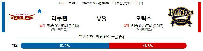 8월30일 NPB 일본 프로야구 라쿠텐 골든이글스 오릭스 버팔로스 분석입니다. 이어질 경기는 오후 6시에 시작이 되는 경기로서, 라쿠텐 생명 파크에서 진행이 됩니다. 라쿠텐 골든이글스 오릭스 버팔로스 두 팀은 퍼시픽리그에 속해있는데, 라쿠텐은 4위를 기록중이고 오릭스는 3위를 기록중입니다.