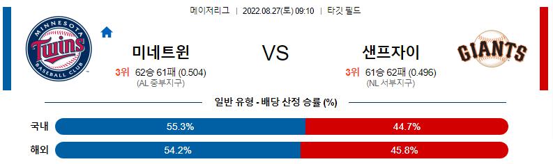 8월 27일 09:10 MLB 미네소타 : 샌프란시스코 MLB분석