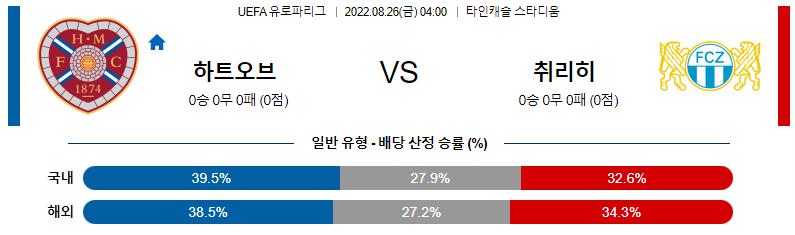 UEFA 유로파리그 8월 26일 04:00 하트 오브 미들로시언 FC : FC 취리히