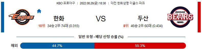 8월26일 KBO 크보 국내 야구 한화 이글스 두산 베어스 경기 분석입니다. 이번경기는 오후 6시 30분에 시작이 되는 경기인데, 한화 이글스의 홈경기가 됩니다. 한화 이글스는 10위를 기록하고 있고 두선 베어스는 8위를 기록하고 있는데 한화 이글스 두산 베어스 두 팀의 전력에서는 두산이 좀더 앞설것으로 보입니다.