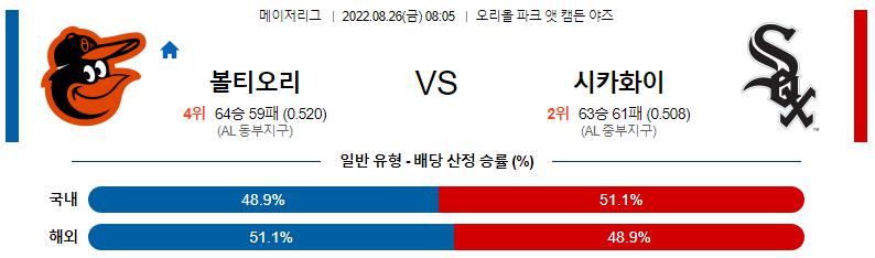 8월 26일 08:05 MLB 볼티모어 : C.화이트삭스 MLB분석