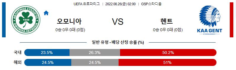UEFA 유로파리그 8월 26일 02:00 AC 오모니아 : KAA 헨트