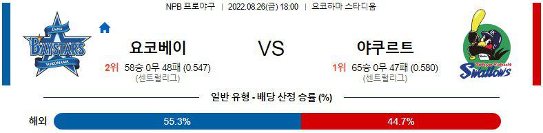 8월26일 NPB 일본 프로야구 요코하마 베이스타스 야쿠르트 스왈로스 경기분석을 시작하겠습니다. 이번경기는 오후 6시에 시작이 되는 경기로서, 요코하마의 홈경기입니다. 요코하마 베이스타스 야쿠르트 스왈로스 두 팀이 센트럴리그에 속해있고, 요코하마는 2위, 야쿠르트는 1위를 기록중입니다.
