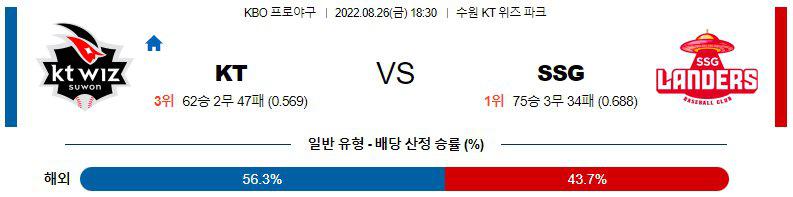 8월26일 KBO 크보 국내 야구 KT 위즈 SSG 랜더스 경기 분석입니다. 이번경기는 오후 6시 30분에 시작이 되는 경기로서, 경기는 KT 위즈의 홈경기로 진행이 됩니다.KT 위즈는 3위를 기록하고 있는 팀이고 SSG는 1위를 기록하고 있는 팀인데, KT 위즈 SSG 랜더스 두 팀의 접전양상의 경기가 될것으로 예상이 됩니다.