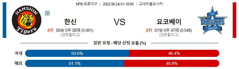 8월24일 NPB 일본 프로야구 한신 타이거스 요코하마 베이스타스 분석입니다. 오후 6시에 시작이 되는 이번경기는 한신이 홈에서 요코하마를 맞이하게되는 경기입니다. 한신 타이거스 요코하마 베이스타스 두 팀은 센트럴리그에 속해있는 팀으로서 한신은 56승57패로 3위를 기록하고 이쏙 요코하마는 56승47패로 2위를 기록중입니다.