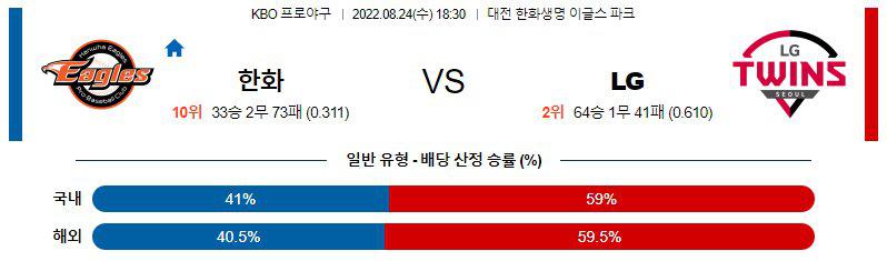 8월24일 KBO 한국 프로야구 한화 이글스 LG 트윈스 경기분석을 시작하겠습니다. 오후 6시 30분에 시작이 되는 이번경기는 한화 이글스의 홈에서 LG 트윈스를 맞이하는 경기입니다. 한화 이글스는 10위를 기록중인 팀이고 LG 는 2위를 기록중인 팀인데 한화 이글스 LG 트윈스 두 팀의 전력에서는 LG가 우세합니다.