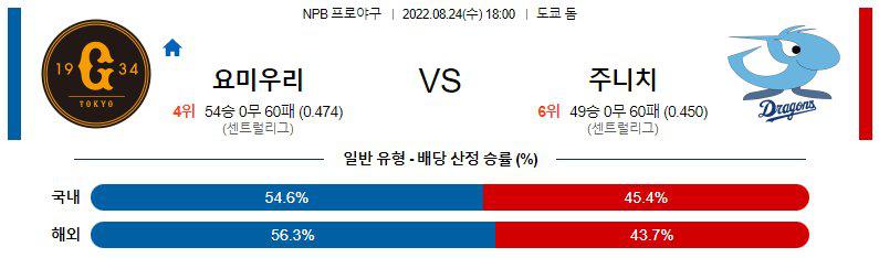 8월24일 요미우리 자이언츠 주니치 드래건스 NPB 일야 분석입니다. 이번 경기는 오후 6시에 시작이 되는데, 요미우리가 홈에서 주니치를 맞이하게되는 경기입니다. 요미우리는 53승60패로 센트럴리그에서 5위를 기록중이고 주니치는 49승59패로 센트럴리그에서 6위를 기록중인데 요미우리 자이언츠 주니치 드래건스 두 팀의 최근 전력에서는 주니치가 좀더 앞설것으로 보입니다.