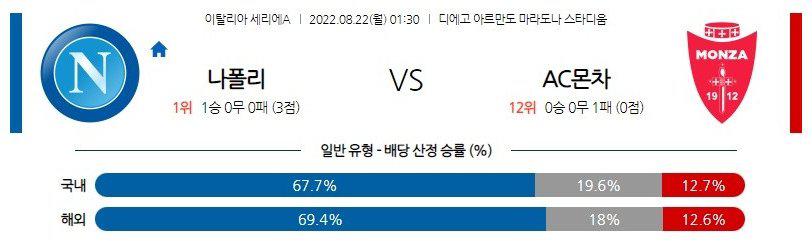 후술하겠지만, 나폴리가 직전 경기에서 보여준 화력을 고려한다면 이번 일정도 오버(2.5 기준) 가능성이 높겠다. 또한 나폴리는 개막전부터 짜임새 있는 속공을 선보이며 5-2 대승을 따냈다. 여기에, 흐비차(FW), 김민재(DF)와 같은 신입 전력들도 맹활약하며 적응을 마친 모습. 반면 몬차는 이번 시즌 승격한 팀으로, 대대적인 선수단 변화가 있었다. 그러나 조직력에서는 여전히 의문 부호가 붙어 있는 상태로, 개막전에서도 패배를 허용했다. 이번 일정도 나폴리의 승리가 예상된다.