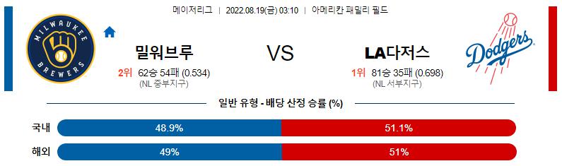 8월 19일 03:10 MLB 밀워키 : LA다저스 MLB분석