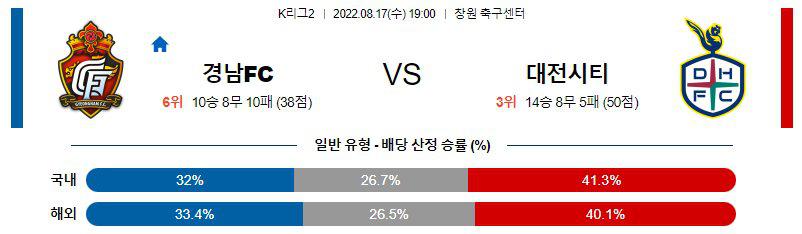 8월17일 경남 FC 대전 하나시티즌 K리그2 한국 프로축구 경기분석을 시작하겠습니다. 이번경기로서는 오후 7시에 시작이 되는 경기인데, 경남 FC의 홈경기로 진행이 됩니다. 경남 FC는 10승8무10패로 6위를 기록하고 있는 팀이고 대전 하나시티즌은 14승8무5패의 전적으로 2위를 기록하고 있는 팀입니다. 경남 FC 대전 하나시티즌 두 팀의 전력에서는 대전 하나시티즌의 우세가 예상이 됩니다.