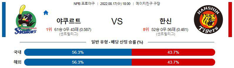 일본프로야구 센트럴리그 도쿄 야쿠르트 스왈로스 한신 타이거스의 경기가 오는 수요일(8/17) 18:00 야쿠르트의 홈 구장인 메이지 진구구장에서 열릴 예정입니다. 도쿄 야쿠르트 스왈로스 한신 타이거스 양 팀 간의 이번 주중 3연전 가운데 두번째로 펼쳐지는 경기입니다.