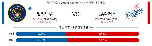 8월 16일 09:10 MLB 밀워키 : LA다저스