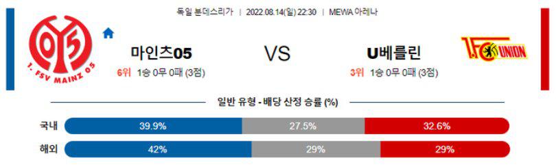 후에 언급하겠지만, 우니온베를린의 득점력은 뛰어난데 반해 수비가 불안한 편이므로 이번 일정에서 오버(2.5 기준) 가능성이 매우 높겠다. 또한 마인츠는 개막전 경기에서부터 짜임새 있는 3백을 바탕으로 승리를 따냈다. 지난 시즌보다 조직력이 더더욱 좋아진 모습. 우니온베를린도 개막전에서 좋은 모습을 보였으나, 마인츠가 지난 시즌 홈에서 단 2패만을 허용했다는 점을 감안하면 이번 일정은 마인츠의 승리가 예상된다.