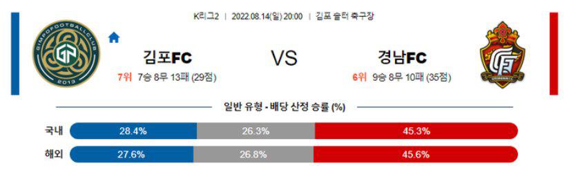 양 팀의 직전 두 차례 맞대결 주소모두 오버(2.5 기준)가 나왔다는 점, 앞선 리그 경기에서도 오버(2.5 기준)가 나온 점을 고려하면 이번 일정도 오버(2.5 기준)의 가능성이 높겠다. 또한 경남의 최근 흐름이 좋은 편은 아니지만, 꾸준한 득점력은 여전한 강점이며, 용병 전력들도 서서히 팀에 녹아 들고 있다. 반면 김포는 최근 수비 불안이 도지면서 좀처럼 승리를 따내지 못하는 중. 여기에 ‘핵심 수비수’ 황도연(DF)이 심각한 부상을 당했다. 이번 일정도 경남의 승리가 예상된다.
