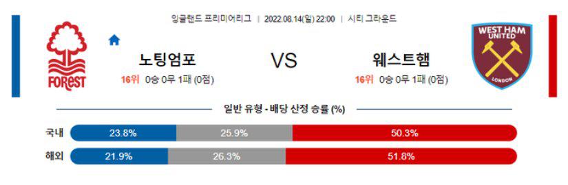 양 팀 주소모두 개막전 무득점으로 일관했다는 점을 고려하면 언더(2.5 기준) 가능성도 있겠다. 또한 노팅엄은 23년만에 1부리그 복귀 경기에서 다소 호흡이 맞지 않는 모습으로 0-2로 패했다. 아직까지 조직력을 더 가다듬어야 할 것으로 보인다. 웨스트햄 역시 수비 쪽 부상으로 인해 100%의 전력이 아니며, 전방에서의 공격 짜임새도 그다지 눈에 띄지 않았다. 양 팀 주소모두 이번 일정에서도 승리 가능성은 없으므로, 무승부가 적당한 선택지가 되겠다.