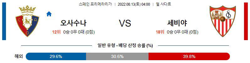 22/23시즌 라리가 개막전은 오사수나가 홈에서 세비야를 상대한다. 지난시즌 오사수나는 저조한 득점에도 불구하고 승점을 차곡히 쌓으며 리그 10위로 나름 준수한 성적으로 마무리를 지었다. 여전히 큰투자 없이 주로 자유계약이나 임대로 선수들을 데려오는 오사수나는 비야레알의 모이 고메즈와 AT 마드리드의 마누 산체스를 데려왔으며 팀내 벤치자원들을 5명이나 대거 자유계약으로 내보내면서 라리가 대표 자린고비 클럽에 맞는 행보를 이번시즌에도 보여주고있다. 세비야 상대로는 가장 최근 승리가 2013년일정도로 매우 취약한편이며 그나마 지난시즌 홈에서 오랜만에 0대0으로 비긴경기가 잘싸운 경기였다. 야고바 아라사테 감독은 433을 꾸준히 사용하는 감독으로 알려졌는데 지난시즌 단점이였던 매우 열악했던 공격력을 보완해야할것이다. 새로온 이적생 모이 고메스는 비야레알에서 나름 슈퍼서브로서 활약했던 선수로서 탈압박과 패싱력이 괜찮은 선수로서 평가받았다. 키케 사베리오, 아이토르 페르난데즈, 안테 부디미르가 부상이며 특히 팀내 대부분의 득점을 맡았던 안테 부디미르의 부재를 어떻게 메울지는 부정적인면이 크다.