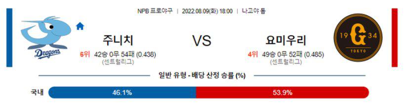 일요일 4연패에서 벗어나는 승리를 기록하며 지난주 1승4패를 기록한 주니치와 4연승 흐름 속에 지난주 4승2패 성적을 기록한 요미우리의 만남 이다. 4연패에서 벗어나는 과정의 경기 내용이 좋았던 주니치에게 이동없이 연속 되는 홈경기 일정을 맞이하게 되었다는 것이 많은 도움이 될것이다. 주니치 승리 가능성을 추천 한다.