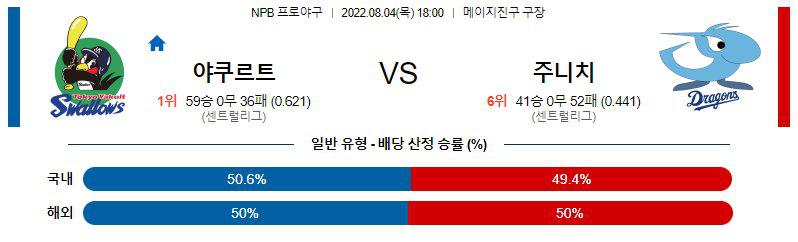8월4일 야쿠르트 스왈로스 주니치 드래건스 NPB 일본 야구경기 분석입니다. 오후 6시에 시작이 되는 이번경기는 야쿠르트가 홈에서 주니치를 맞이하게되는 경기입니다. 야쿠르트 스왈로스 주니치 드래건스 두 팀은 센트러리그에 속해있는데, 야쿠르트는 1위를 기록하고 있고 주니치는 6위를 기록하고 있습니다.