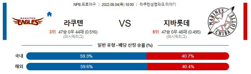 8월4일 NPB 일본 프로야구 라쿠텐 골든이글스 지바롯데 마린스 경기분석을 시작하겠습니다. 이어질 경기는 오후 6시에 시작이 되는 경기로서, 라쿠텐의 생명 공원에서 진행이 되는 경기입니다. 라쿠텐 골든이글스 지바롯데 마린스 두 팀은 퍼시픽리그에 속해있는데, 라쿠텐은 4위를 기록중이고 지바롯데는 5위를 기록중입니다.