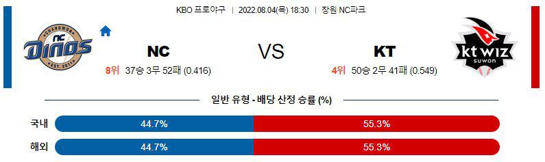 8월4일 NC 다이노스 KT 위즈 KBO 한국 야구 경기분석을 시작하겟습니다. 이번경기는 오후 6시 30분에 시작이 되는 경기인데, NC 다이노스의 홈에서 진행이 되는 경기입니다. NC 다이노스는 8위를 기록하고 있는 팀이고 KT는 4위를 기록하고 있는 팀인데, NC 다이노스 KT 위즈 두 팀의 전력에서는 KT가 좀더 앞서고 있습니다.
