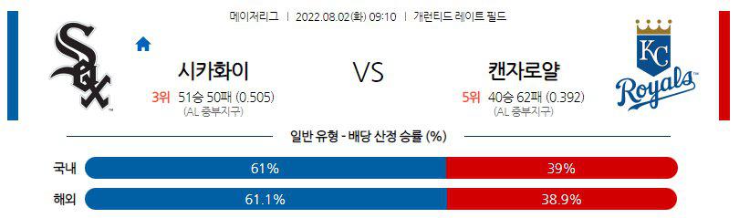 【MLB】 8월 2일 시카고 vs 캔자스시티