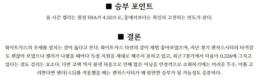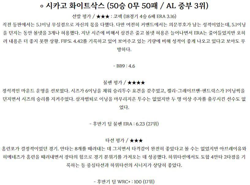시카고 화이트삭스 (50승 0무 51패 / AL 중부 3위) 선발 평가 / ★★ : 지올리토 (18경기 6승 6패 ERA 5.14) 지난 등판에서는 콜로라도를 상대로 5이닝 3실점으로 다소 부진했다. 7월 처음 세 경기에서 주소모두 6이닝 이상을 소화하는 등 안정적인 모습을 보이나 했지만 7월 22일 클리블랜드전 3이닝 6실점을 기록한 이후 다시 부진의…
