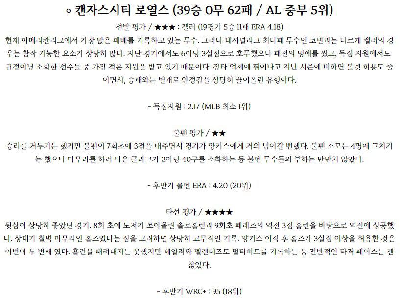 뉴욕 양키스 (70승 0무 33패 / AL 동부 1위) 선발 평가 / ★★★ : 타이욘 (20경기 10승 2패 ERA 3.72) 지난 등판에서는 캔자스시티를 상대로 6이닝 무실점 호투를 펼쳤으나 승리투수는 되지 못했다. 기본적으로 자신의 공을 믿고 공격적으로 피칭을 하는 투수라 피안타도 제법 많이 맞는 투수지만 지난 경기에서는 4피안타만 내주면서 상대 방망…