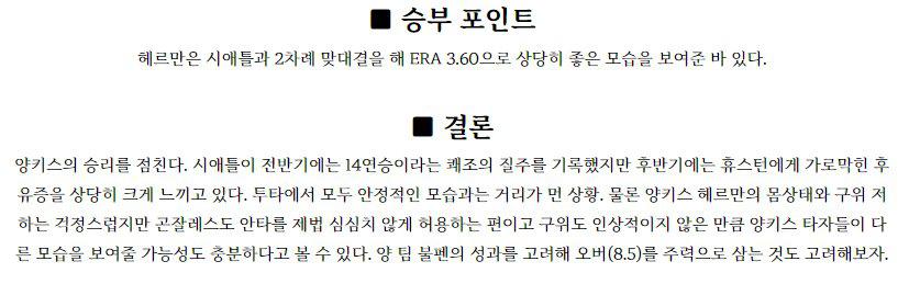 .에인절스(43승 58패 / 리드 데트머스 3승 3패, 3.84) 데트머스는 7월 마이너에서 복귀후 치른 3경기에서 1승(2QS) 1.06의 성적을 기록하고 있다. 변화구 제구가 상당하고 피안타율은 0.172밖에 되지 않는다. 지난 노히터 경기 이후 하락세를 완벽하게 끊어낸만큼 오늘도 준수한 피칭을 펼쳐줄것으로 기대된다. 그리고 오늘 불펜에서는 어제…