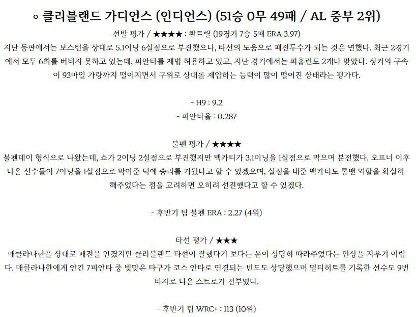 롯데 자이언츠 (39승 4무 51패 / 리그 7위) 선발 평가 / ★★★ : 이인복 (19경기 8승 7패 ERA 3.77) 지난 등판에서는 4이닝 3실점을 기록하면서 다소 부진했던 모습. 컨디션이 좋지 못했는지 구위가 밋밋한 모습이었으며 피안타 7개를 허용하면서 무너지고 말았다. 물론 투심 장착 이후 땅볼유도형 투수로 스타일이 바뀌면서 BABIP과 타…