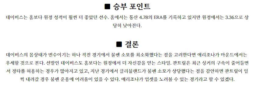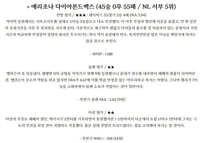 한화 이글스 (28승 2무 63패 / 리그 10위) 선발 평가 / ★★★★ : 장민재 (21경기 4승 4패 ERA 3.67) 우천 취소로 인해 로테이션이 밀렸지만 선발 투수 변동은 없다. 시즌 초반에는 이닝 소화능력에서 기복이 조금 있었으나 최근 5경기에서는 ERA 1.69로 매우 좋은 모습을 보여주고 있다. 빠른공을 던지는 공은 아니지만 커맨드가 괜찮…