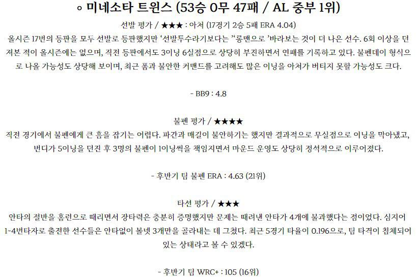탬파베이(54승 47패 / 쉐인 맥클라나한 10승 3패, 1.76) 맥클라나한은 직전 볼티모어와의 경기에서 7이닝 2실점을 기록했다. 13경기 연속 QS피칭을 기록했다는 점만으로 굉장히 고무적인 상황!! 강속구와 변화구 제구 강점을 문제없이 보여주고 있는 상황이기떄문에 오늘도 호투가 기대된다. 그리고 오늘 불펜운용은 문제없을 전망이다. 클리블랜드(5…
