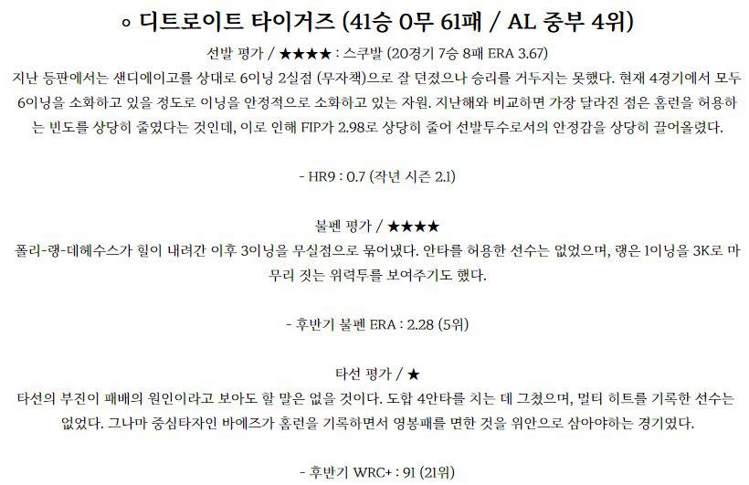 .에인절스(43승 58패 / 리드 데트머스 3승 3패, 3.84) 데트머스는 7월 마이너에서 복귀후 치른 3경기에서 1승(2QS) 1.06의 성적을 기록하고 있다. 변화구 제구가 상당하고 피안타율은 0.172밖에 되지 않는다. 지난 노히터 경기 이후 하락세를 완벽하게 끊어낸만큼 오늘도 준수한 피칭을 펼쳐줄것으로 기대된다. 그리고 오늘 불펜에서는 어제…
