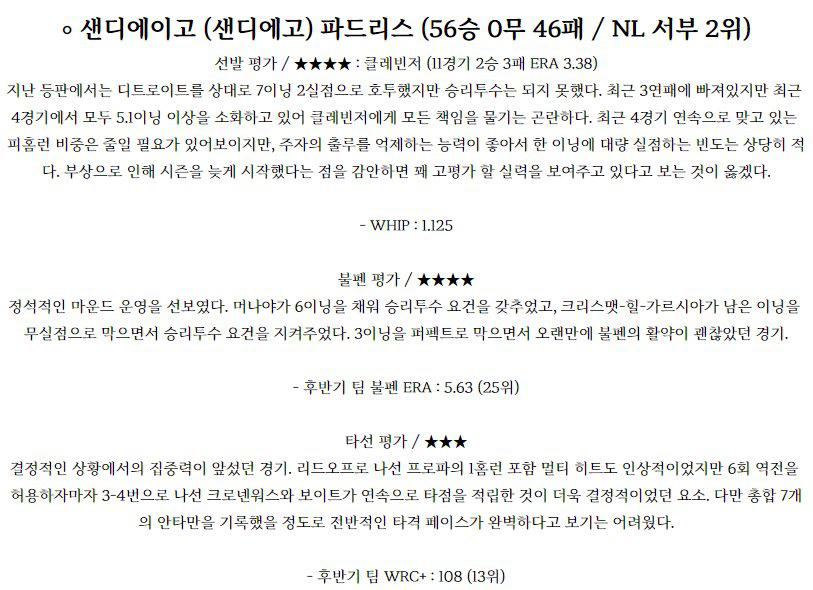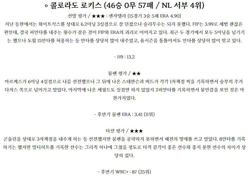 한화 이글스 (28승 2무 63패 / 리그 10위) 선발 평가 / ★★★★ : 장민재 (21경기 4승 4패 ERA 3.67) 우천 취소로 인해 로테이션이 밀렸지만 선발 투수 변동은 없다. 시즌 초반에는 이닝 소화능력에서 기복이 조금 있었으나 최근 5경기에서는 ERA 1.69로 매우 좋은 모습을 보여주고 있다. 빠른공을 던지는 공은 아니지만 커맨드가 괜찮…