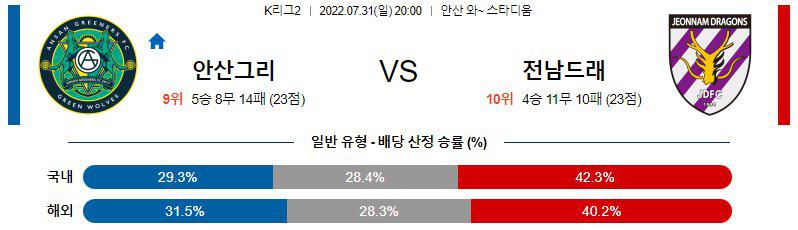 7월31일 K리그2 안산 그리너스 전남 드래곤즈 한국 프로축구 경기분석을 시작하겠습니다. 이어질 경기는 오후 20시에 시작이 되는 경기로서 안산 그리너스의 홈에서 진행이 되는 경기입니다. 안산 그리너스는 5승9무14패로 9위를 기록하고 있고 전남 드래곤즈는 4승11무10패로 10위를 기록하고 있는데, 안산 그리너스 전남 드래곤즈 두 팀의 접전이 예상이 되는 경기입니다.