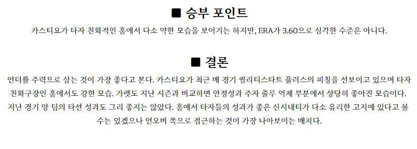 ◈두산(스탁 7승6패 3.01) 스탁 투수는 이전경기(7/22) 홈에서 SSG 상대로 7이닝 무실점 노디시전을 기록했으며 이전경기(7/13) 원정에서 NC 상대로 5.2이닝 4실점 패배를 기록했다. 2연패 흐름 속에 올시즌 KBO 무대 데뷔후 19경기 7승6패, 11경기 QS 성적이며 5월 5경기, 2승2패, 2.61, 6월 5경기 2승2패, 4.76,…