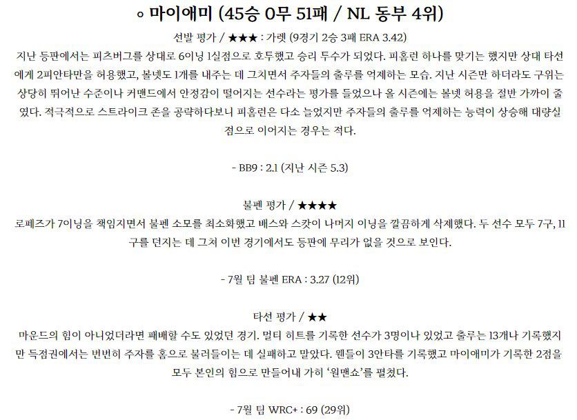◈KT(벤자민 1승2패 4.01) 벤자민 투수는 이전경기(7/22) 원정에서 한화 상대로 5이닝 4실점(3자책) 패배를 기록했으며 이전경기(7/8) 홈에서 롯데 상대로 6.2이닝 2실점 노디시전을 기록했다. KBO 무대 데뷔후 5경기 1승2패, 2경기 QS 성적이며 6월 2경기 1패, 3.86, 7월 3경기 1승1패, 4.08의 기록. 벤자민 투수는 빅…