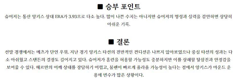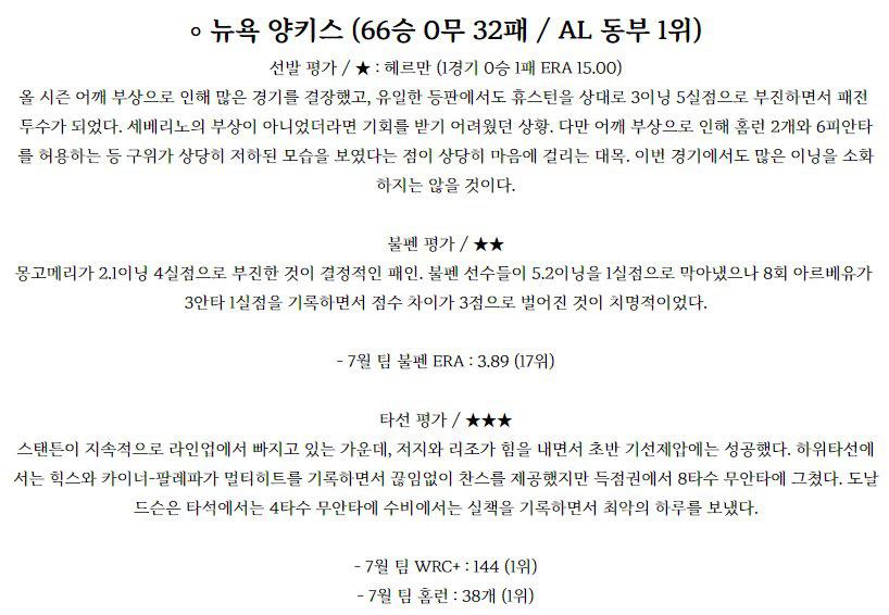◈삼성(원태인 4승5패 3.62) 원태인 투수는 이전경기(7/22) 원정에서 키움 상대로 4.2이닝 1실점 노디시전을 기록했으며 이전경기(7/12) 원정에서 KT 상대로 5이닝 2실점 노디시전을 기록했다. 올시즌 16경기 4승5패, 6경기 QS 성적이며 5월 5경기 2승2패, 3.34, 6월 4경기 1승2패, 3.46, 7월 3경기 승패없이 4.60의 …