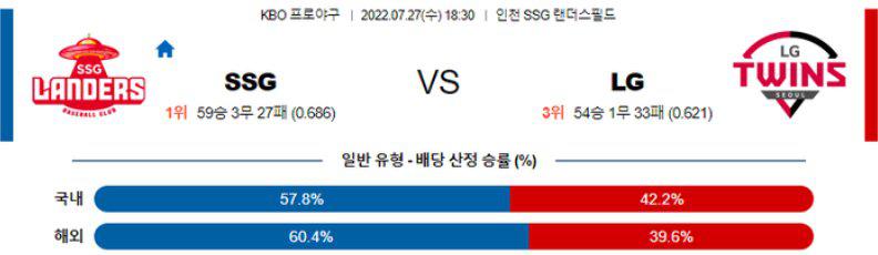 오지환 연타석포에 플럿코 10승 완벽투까지 더해지면서 전일 경기 9-0 승리로 SSG의 8연승을 저지하는데 성공한 LG의 기세를 무시할수 없지만 직구와 변화구 주소모두 같은 팔회전과 궤도에서 나와 구종 파악이 어렵다는 장점을 가지고 있는 모리만도 투수에게 생소함 이라는 추가적인 무기가 장착되는 만큼 선발 싸움에서 모리만도 투수가 우위에 있는 경기다. 또한, 전일 오원석 투수가 조기강판 패배를 기록한 이후 필승조 불펜을 아끼며 후일을 대비하는 수순을 밟은 SSG 마운드가 모리만도 투수 이후 뒷문을 지켜낼 것으로 예상된다. SSG 승리 가능성을 추천 한다.