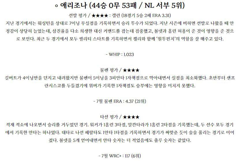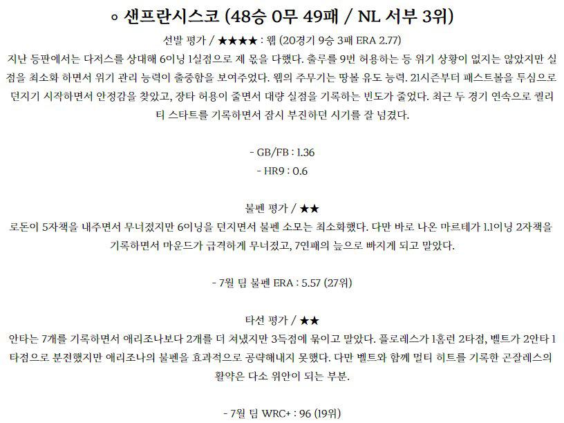 【MLB】 7월 28일 애리조나 vs 샌프란시스코