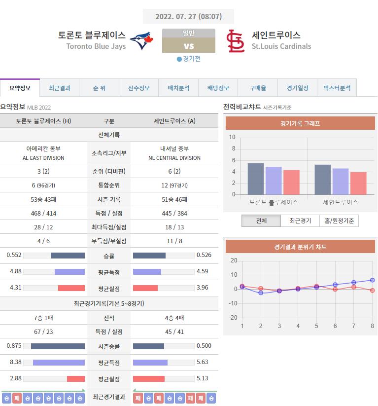 [스포츠분석][MLB분석] 7월 27일 MLB 분석 토론토 VS 세인트루이스 [출처] [스포츠분석][MLB분석] 7월 27일…