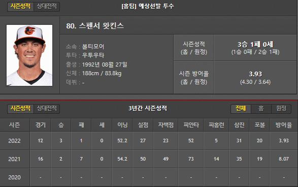 볼티모어는 이번 경기 스펜서왓킨스 선수가 선발로 등판합니다.