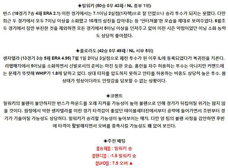 두산 베어스 (이영하 6승5패 4.26) 이영하 투수는 직전경기(7/10) 홈에서 LG 상대로 3이닝 4실점 패배를 기록했으며 이전경기(7/5) 홈에서 키움 상대로 5.1이닝 1실점 노디시전을 기록했다. 3연승이 중단되는 패배가 나왔으며 올시즌 17경기 6승5패, 7경기 QS 성적이며 5월 5경기 2승1패, 2.52, 6월 5경기 3승1패, 3.64…