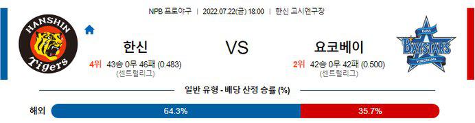주중 1승1패를 기록한 한신과 2승1패 성적을 기록한 요코하마의 만남 이다. 센트럴리그 다승과 평균자책점 1위를 달리고 있는 아오야기 코요우 투수를 상대로 주니치가 정면 승부를 피하는 선발 카드를 꺼낸 상황. 한신 승리 가능성을 추천 한다.
